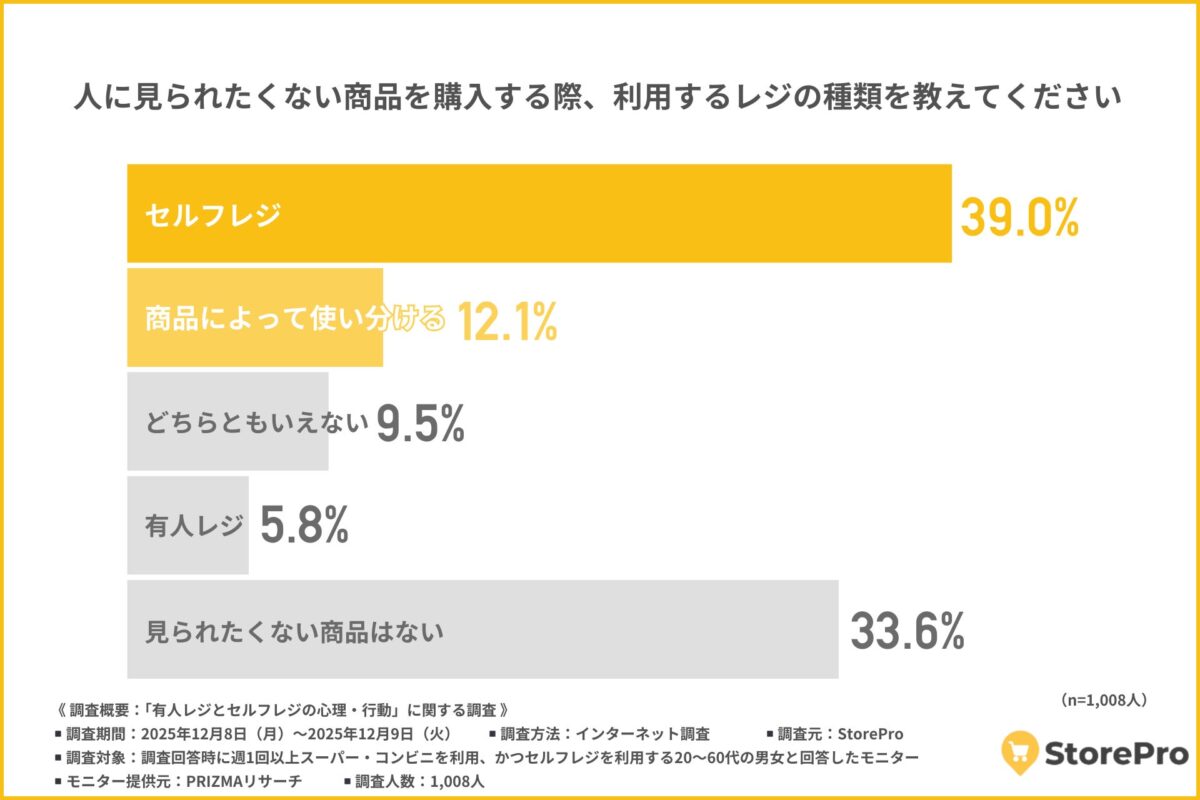 「人に見られたくない商品を購入する際に選ぶレジの種類」について質問したところ、『セルフレジ(39.0%)』と回答した方が最も多く、『商品によって使い分ける(12.1%)』と続きました。