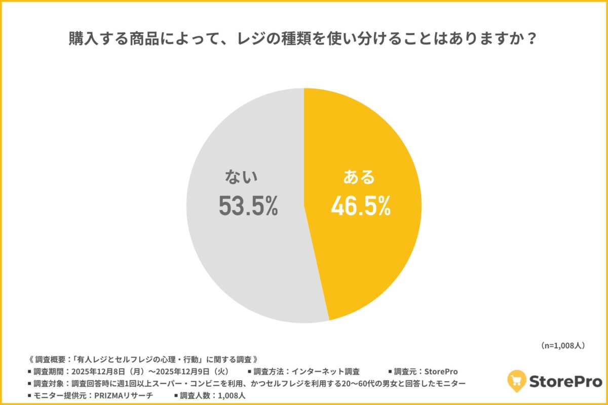 商品によってレジを使い分ける方が約半数存在することから、利用者は単に会計の速さのみならず、購入内容に応じた心理的な安心感も重視している可能性があります。