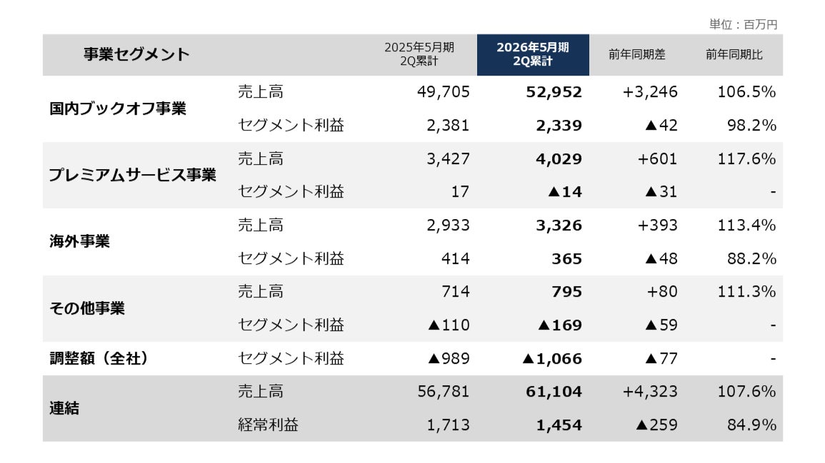 ブックオフグループホールディングス株式会社(本社:神奈川県相模原市、代表取締役社長:堀内康隆)が、2026年1月13日に2026年5月期第2四半期決算を発表しました。第2四半期累計の連結売上高は611億400万円(前期比107.6%)となったことが明らかになっています。