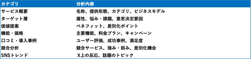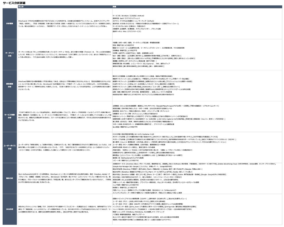 さらに、単純な情報収集にとどまらず、「なぜユーザーはこのサービスを選択するのか」「競合が訴求していない切り口は何か」といったマーケティング視点での洞察を生成します。