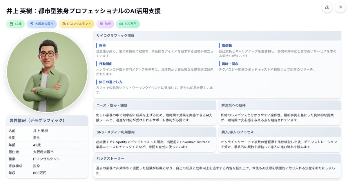 これにより、ペルソナ設計やマーケティングリサーチに要する時間を大きく短縮し、多忙な営業現場においても短時間でターゲット理解を深めることができるようになるとのことです。