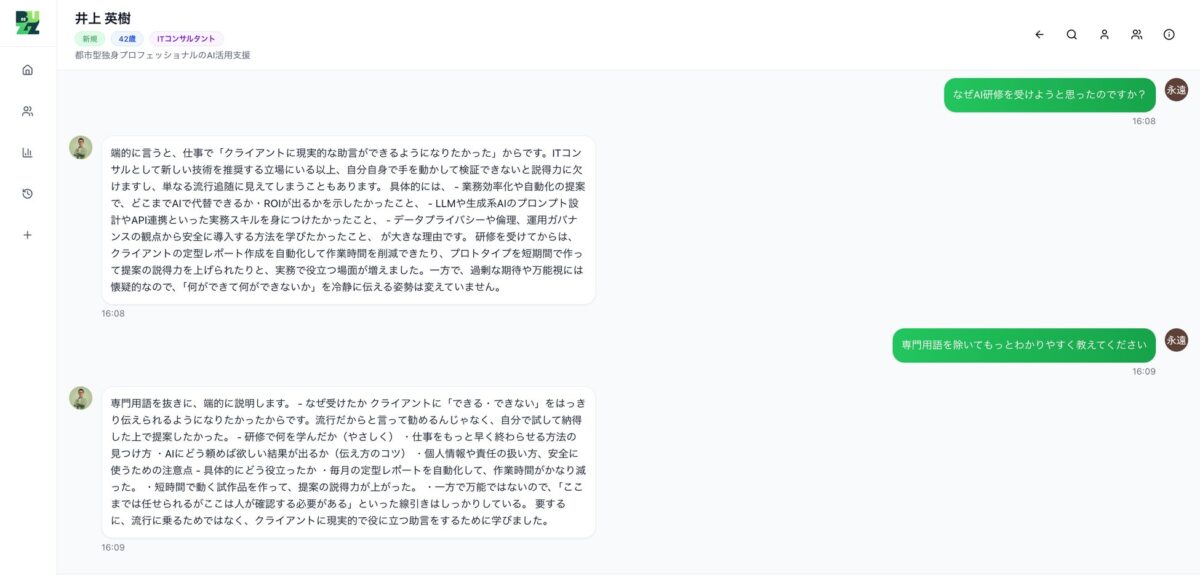 同ツールは、商品やサービスに関する情報を入力するのみで、複数のペルソナを自動で作成し、それらのペルソナとの"対話"を通じて、購買意欲や本音を直接ヒアリングできるN=1インタビュー体験を実現するものとなっています。