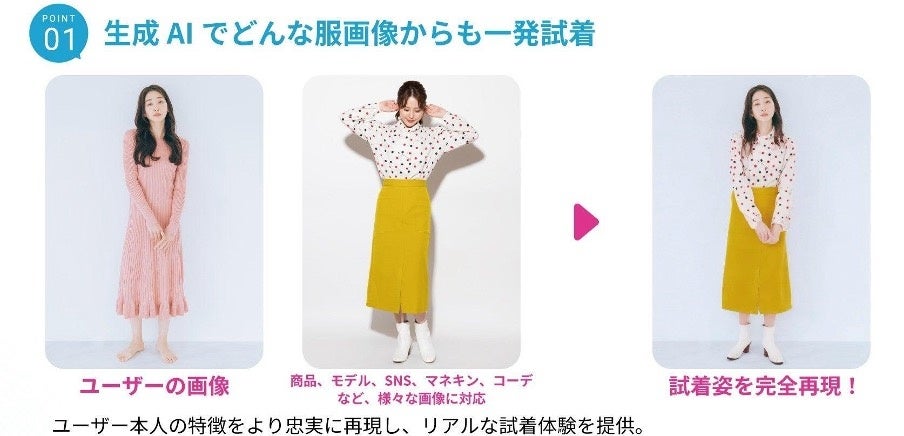 「AI服試着ツール」は、1枚の写真からさまざまなデザインやカラーの衣服を瞬時に試すことができるソリューションです。リアルに近い試着体験を実現し、購入前の不安を軽減するとともに、オンラインショップや店舗での顧客エンゲージメントを高めます。これにより、ファッション業界における新しい購買スタイルの創出をサポートしているとのことです。