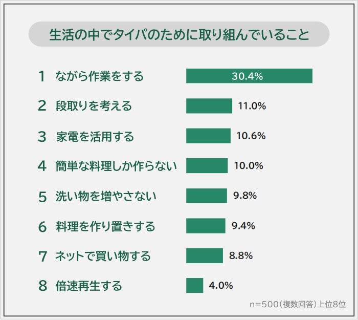 「生活の中でタイパのために取り組んでいること」について質問したところ、1位は「ながら作業をする(30.4%)」という結果になりました。2位「段取りを考える(11.0%)」、3位「家電を活用する(10.6%)」、4位「簡単な料理しか作らない(10.0%)」と続きます。