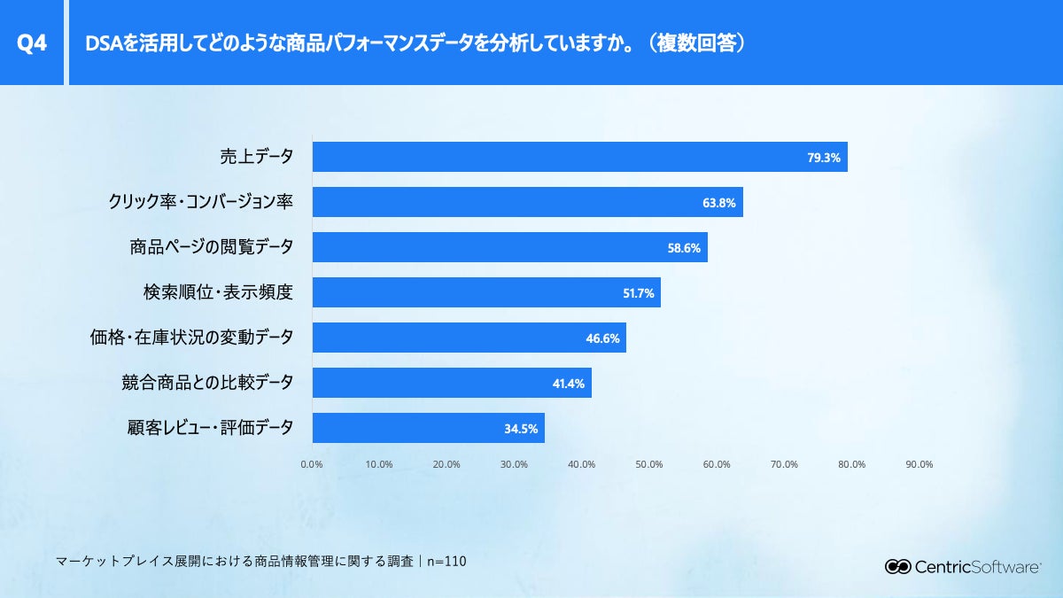 DSAを使用している企業では、売上データ(79.3%)、クリック率・コンバージョン率(63.8%)、商品ページ閲覧データ(58.6%)などを中心に分析が行われている状況です。