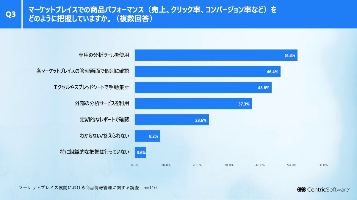 - マーケットプレイスの商品パフォーマンス把握に「専用の分析ツール」を使用している企業は51.8%となりました