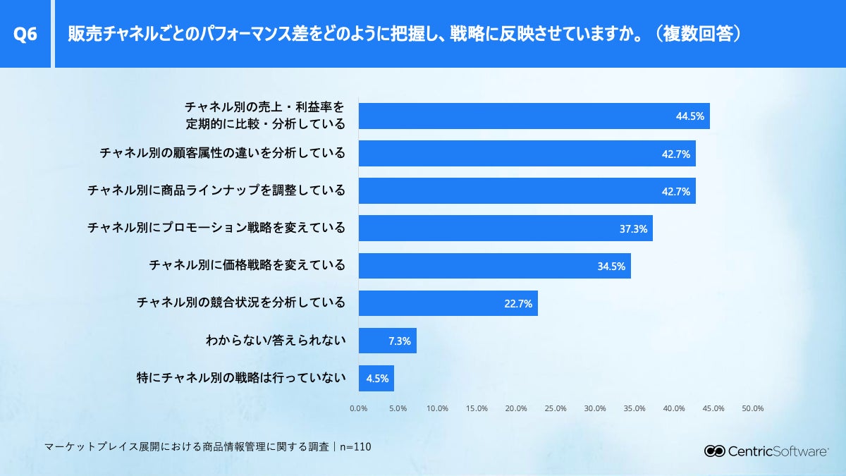 販売チャネルごとのパフォーマンス差については、44.5%が「売上・利益率を定期的に比較・分析」、42.7%が「顧客属性の違いを分析」と回答しています。マーケットプレイスを単独で見るのではなく、チャネル横断で商品戦略を最適化する動きが進んでいる状況が確認されました。