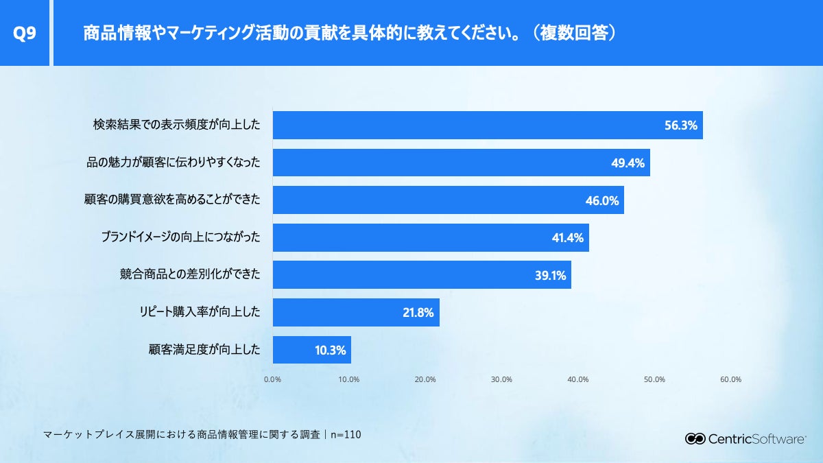 79.1%が、商品情報やマーケティング活動がマーケットプレイスのパフォーマンスに「貢献している」と回答しました。特に、以下のような効果が上位に挙がっています。
