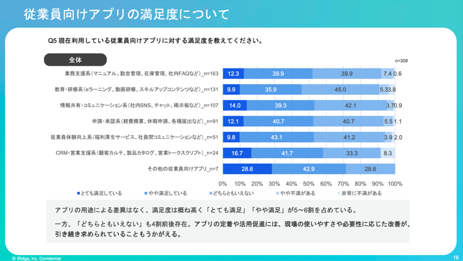 ただ、実際に従業員向けアプリを利用している人に対してその満足度を質問したところ、5〜6割が『とても満足』『やや満足』という回答でした。導入すればそれなりの成果が期待できるといえそうですが、そこまでの投資には踏み込めていないという現状が見て取れます。