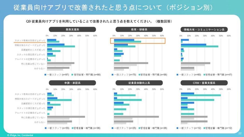 これは実際にアプリを導入している企業へのアンケート結果ですが、教育・研修系の結果を見ると、『スタッフ教育の効率が上がった』と感じられている方は一般スタッフにも管理者層にも多くいらっしゃいます。アプリ導入で一定の効果が得られることは期待できそうです。