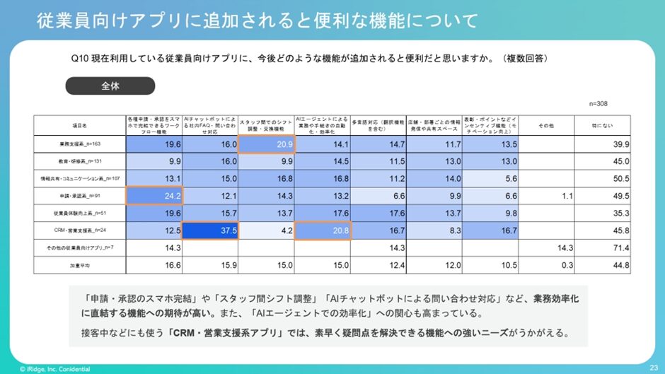 もう少し踏み込んで、従業員向けアプリに今後期待することを聞いた質問では、営業支援系でのAI活用によるFAQ・問い合わせ対応やスタッフ間でのシフト調整などが要望として挙がってきています。