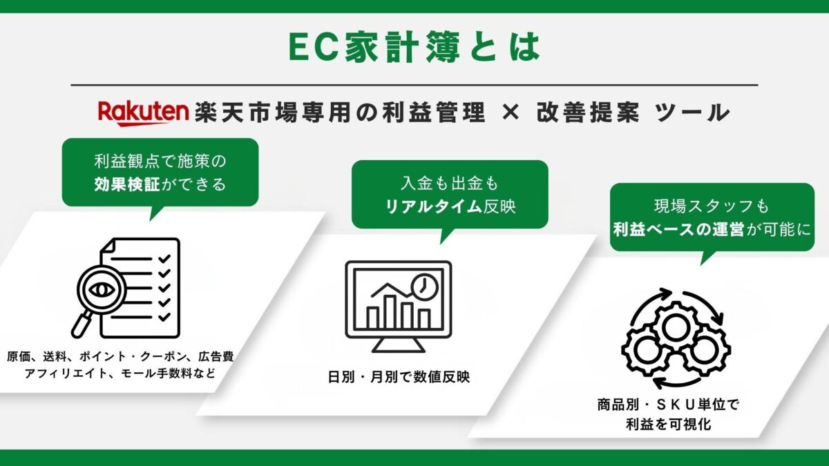 「EC家計簿」は、EC事業者が日々の運営における判断を「利益基準」で行うための利益管理・改善支援サービスとして開発されました。