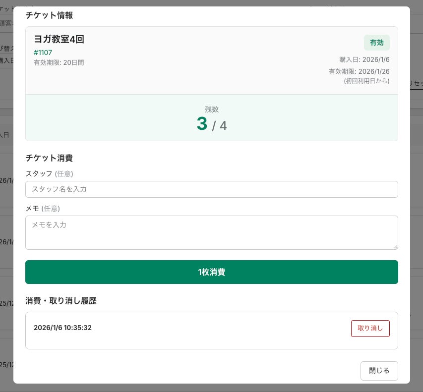3つ目は、スタッフ向けの消費管理機能です。顧客を検索してチケットの詳細を確認できるほか、使用記録にスタッフ名やメモを付けて管理することができます。誤って記録してしまった消費についても取り消すことが可能です。