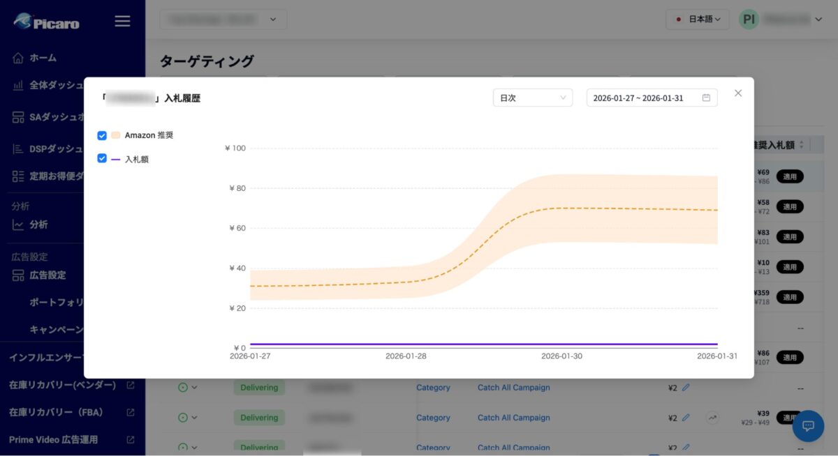 Amazonが提示する推奨入札単価について、単なる数値表示ではなく、時系列のトレンドとして可視化する機能を搭載しています。