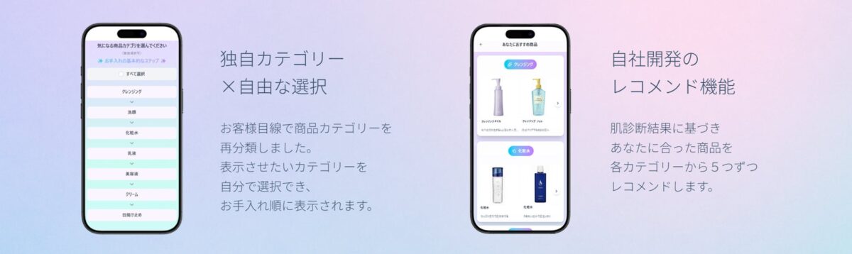 商品レコメンド画面では、利用者自身が商品カテゴリーを自由に選択できる設計を採用しました。9つの商品カテゴリーすべてを閲覧することはもちろん、たとえば「化粧水と乳液だけを知りたい」といった場合には、その2つだけを選択して表示させることが可能です。カテゴリーごとに5つの商品がレコメンドされ、比較検討しやすい構成になっています。