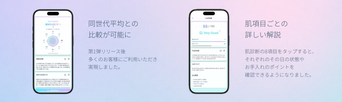 同世代平均との比較機能は、第1弾リリース後に蓄積された診断データを活用した機能であり、利用者の増加とデータの蓄積によって実現できた価値ある追加機能です。自身の肌状態を客観的に把握できることで、スキンケアへの取り組み方にも変化が生まれることが期待されています。
