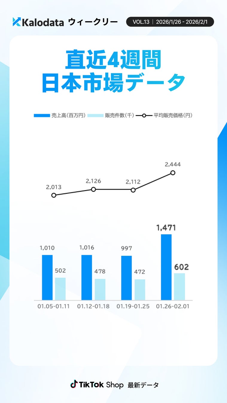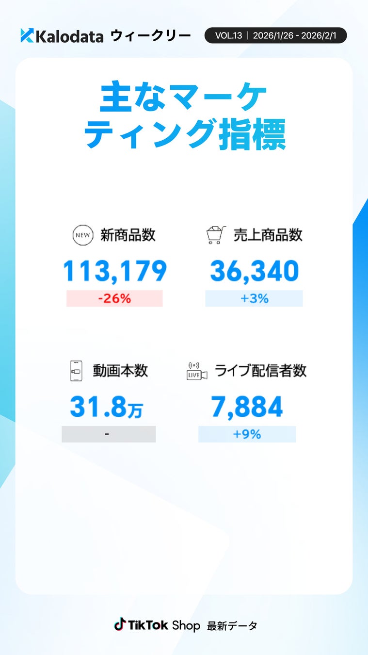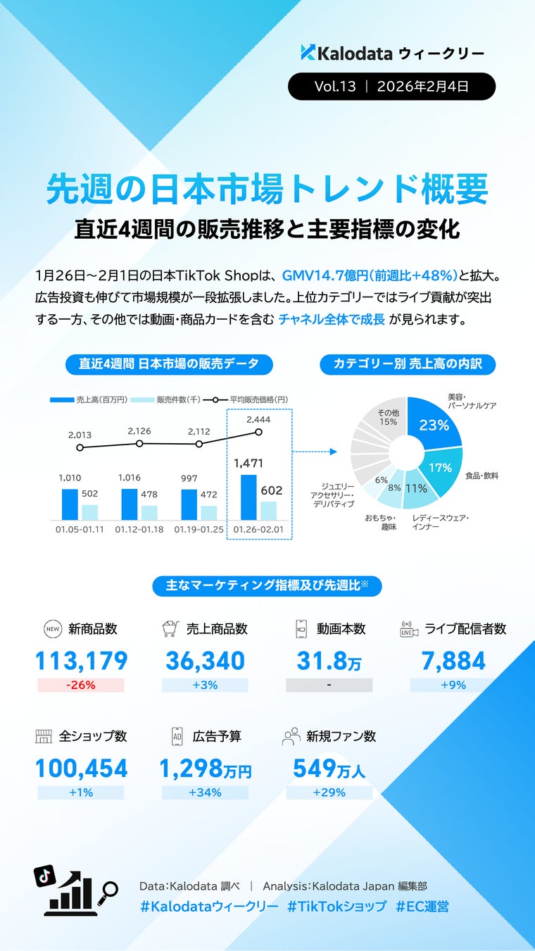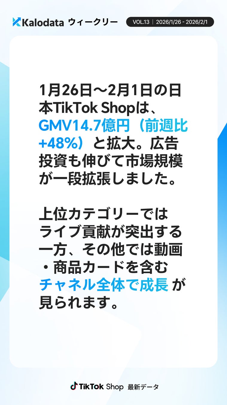 株式会社Kalowave Japanが運営するKalodata Japanによる最新のデータ分析結果が発表されました。2026年1月26日から2月1日までの日本TikTok Shop市場におけるGMVは14.7億円に達し、前週と比較して48%の大幅な増加を記録したとのことです。販売数量、平均商品単価、広告への投資金額が揃って増加し、市場全体の規模が一段階引き上げられる形となっています。動画投稿数は前週と同水準で推移した一方で、ライブ配信を行うクリエイター数は増加傾向にあり、売上の成長は主要カテゴリーではライブ配信主導の拡大、その他のカテゴリーでは動画および商品カード経由での積み重ねが同時進行する構造が明らかになりました。