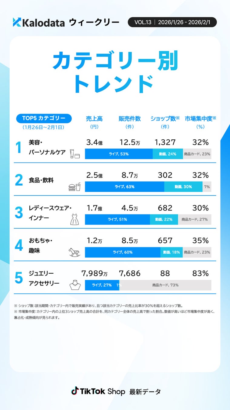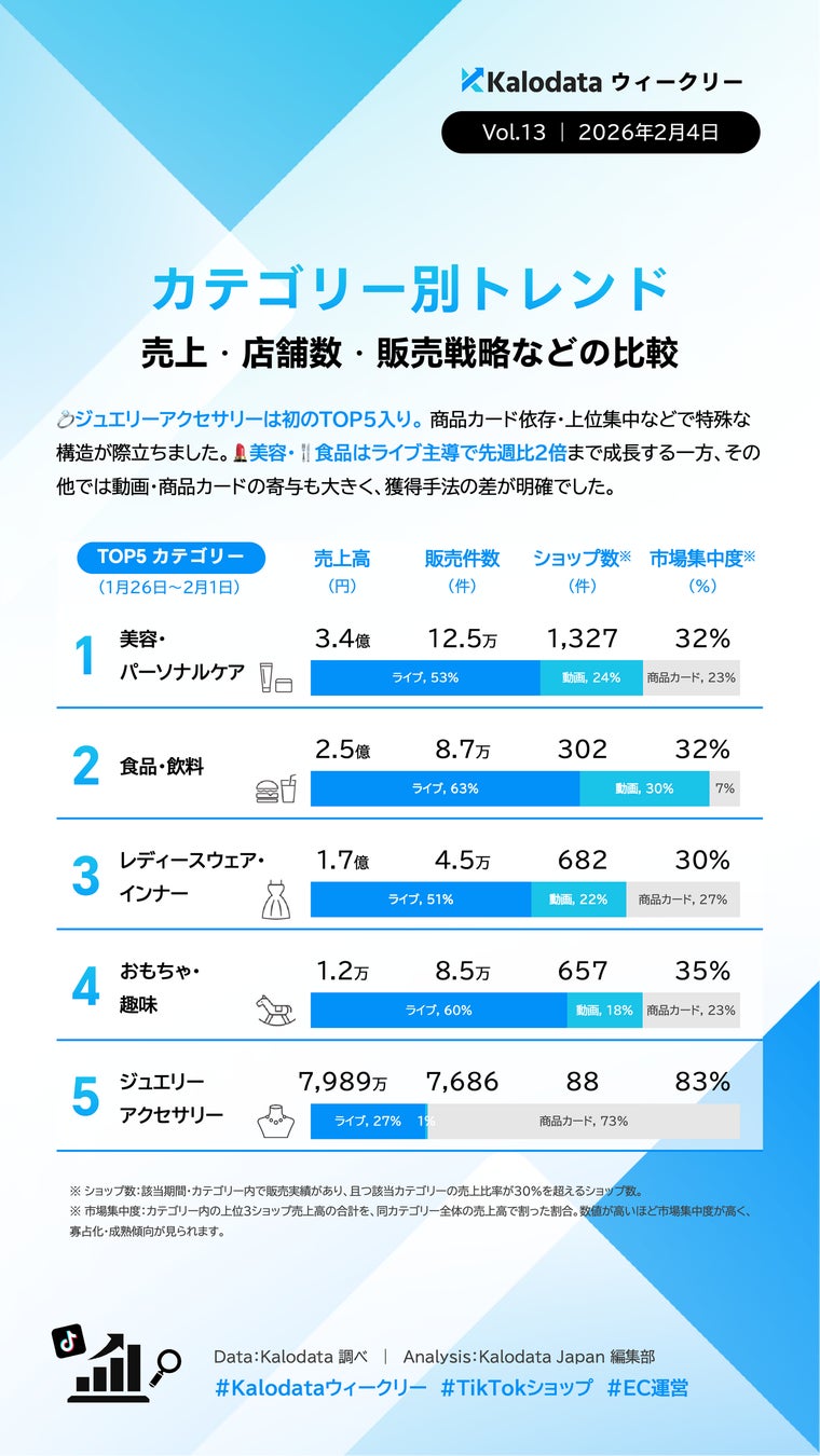 カテゴリー別の動向を見ると、ジュエリーアクセサリーが初めて上位5位以内にランクインし、商品カード経由での売上が全体の73%を占めており、上位3店舗への集中度が83%に達するなど、特定の販売構造に大きく依存している状況が顕著となったそうです。一方、美容・パーソナルケアカテゴリーおよび食品・飲料カテゴリーではライブ配信経由の売上が前週と比べて大幅に増加し、GMVが約2倍に拡大しています。その他のカテゴリーにおいては動画や商品カード経由での貢献が相対的に大きく、カテゴリーごとに効果的な顧客獲得チャネルが異なる傾向がより明確化してきているということです。