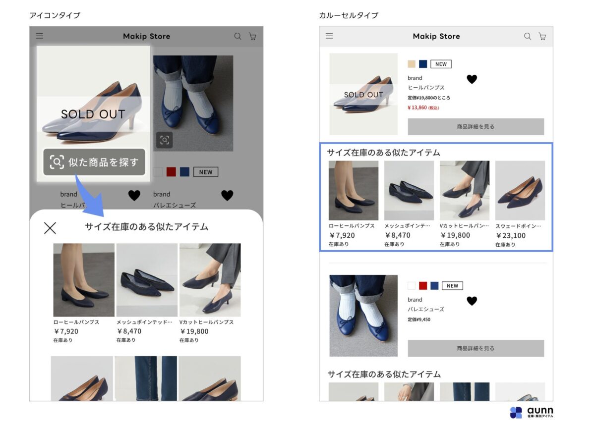 こうした課題を受けて、メイキップは従来、洋服やバッグを適用対象としていた「aunn 在庫・類似アイテム」のサービス範囲を拡大し、新たにシューズカテゴリーを対象範囲に加えました。