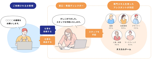 タスカルは他のオンラインアシスタントサービスと比べると安価な価格になっています。その理由は、業務の依頼から完了までのやりとりを全てオンラインで行うからです。仕事を依頼したい場合は窓口となる専属ディレクターにお願いするだけ。スタッフの手配から、仕事の割り当てまでを専属ディレクターが行ってくれます。採用コストはかからないですし、クラウドソーシング系のサービスと違って、適切な人材を自分たちで探す必要もないのが特徴です。