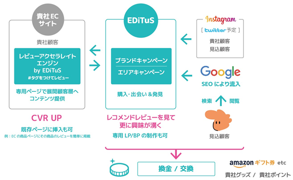 その新たなマーケティング手法として自動的に売れる仕組みをつくる「レビューアクセラレイトエンジン(以下RAE)」を提供する。RAEの具体的な機能としてインスタグラムやAmazonアソシエイト・プログラムとも連携し、カテゴリーごとにレビューを集めEDiTuSにも直接投稿できる仕様で、これらレビューがSNSから集まってくると、以下の流れで購入率の向上が実現し、飛躍的に購買量が向上する仕組みとなる。