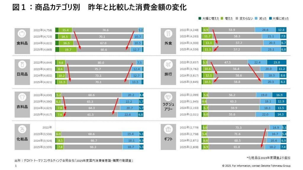 業界情報・プレスリリース デロイト トーマツ グループ 消費者の財布のひもが再び締まる?―デロイト トーマツ調査で読み解く2025年の購買行動 2025年7月31日 デロイト トーマツ グループが公表した「2025年度 国内消費者意識・購買行動調査」により、インフレ下の日本における消費者心理の変化が鮮明になりました。本調査は全国の20...