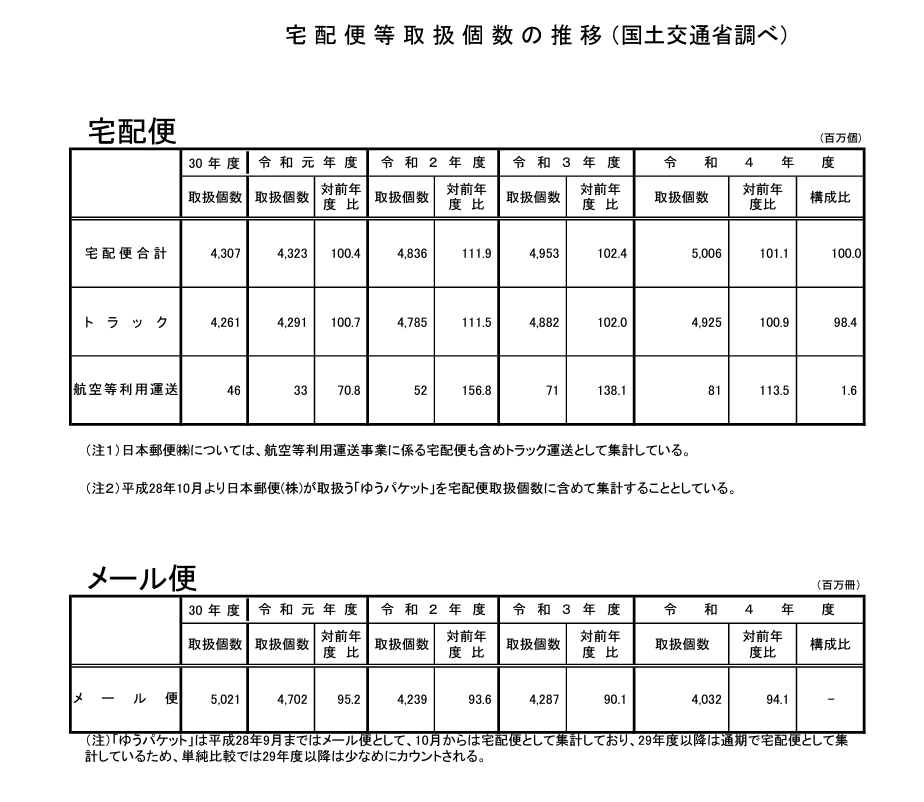 〇令和4年度の宅配便取扱個数は、50 億588 万個で、前年度と比較して5265 万個・約1.1%の増加となった。〇令和4年度のメール便取扱冊数は、40 億3223 万冊...