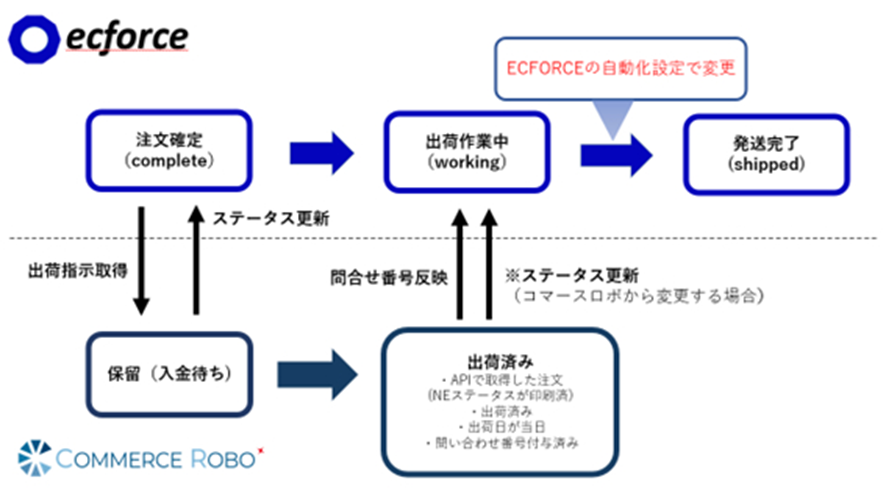業界情報・プレスリリース eコマース専用自動出荷システム「コマースロボ」が「ecforce」との出荷実績API連携で配送会社の連携機能を追加 2023年1月12日 eコマースの自動化型DXサービスを提供する株式会社コマースロボティクス(本社:東京都港区、代表取締役:伊藤彰弘)は、eコマースの受注から出荷を自動化するシステム「コマース...